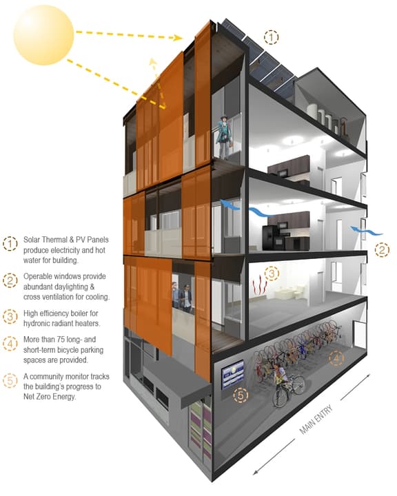 The first “Path to Net Zero Energy” project in the Energy Trust of Oregon’s initiative, ecoFLATS exceeds typical ventilation and cooling standards through the building’s orientation and affordable construction. One of the first contemporary Portland projects to offer operable windows and covered exterior corridors when completed in 2009, the deliberate design of the building allows for generous access to natural light and fresh air. Large solar panels and a solar thermal water heating system also contribute toward offsetting the building’s energy usage. Display screens in the lobby share real-time usage for each unit, providing helpful updates and creating friendly competition among residents to lower energy consumption.