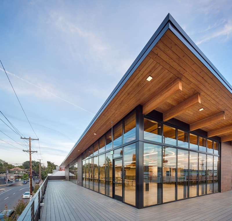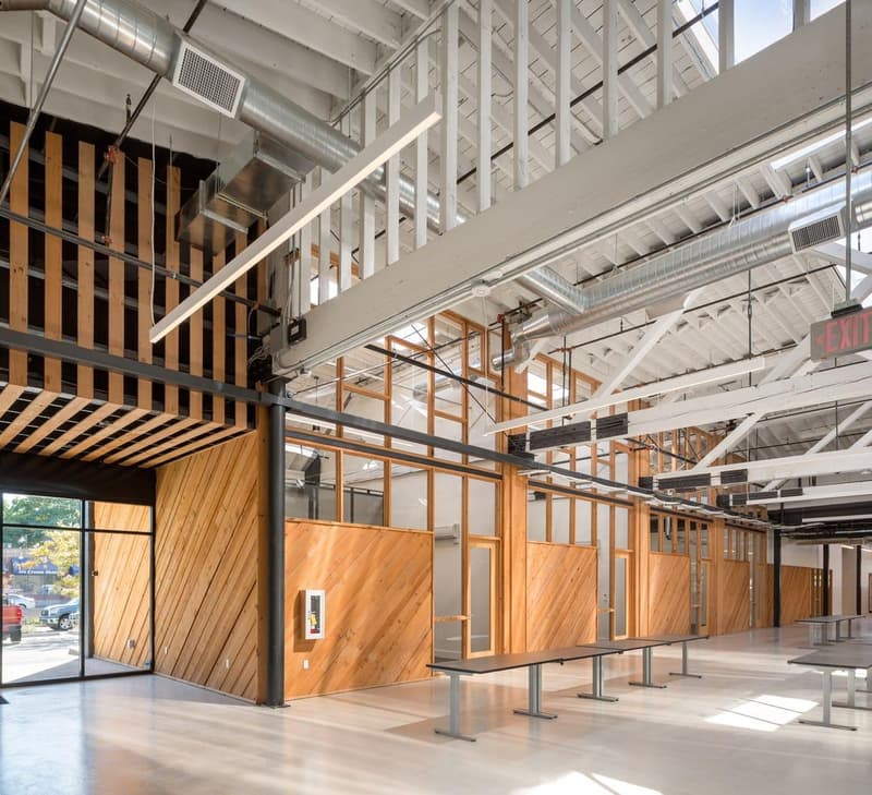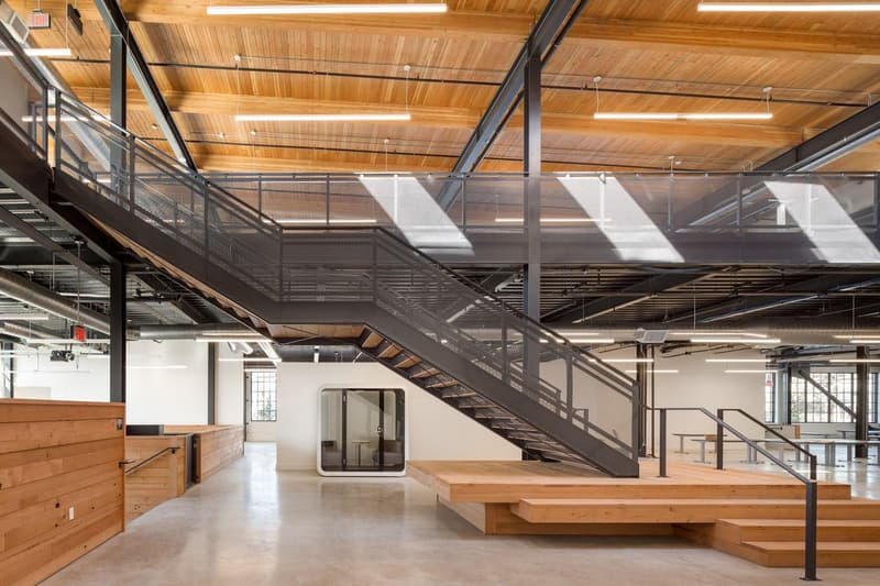 The completed headquarters adds natural light, modern materials, and technology throughout the previously dark and decrepit spaces, complementing the historic masonry and salvaged heavy timber trusses. A heavily glazed 8,000 square foot rooftop addition adds a unique amenity space and offers stunning views of downtown Portland. Extensive work was also done to the long-neglected streetscape around the property to meet the open ethos of the area. Local trees and plants were added to the landscaping, and new sidewalks, curbs, and stormwater planters connect the previously closed-off façade to the surrounding neighborhood.