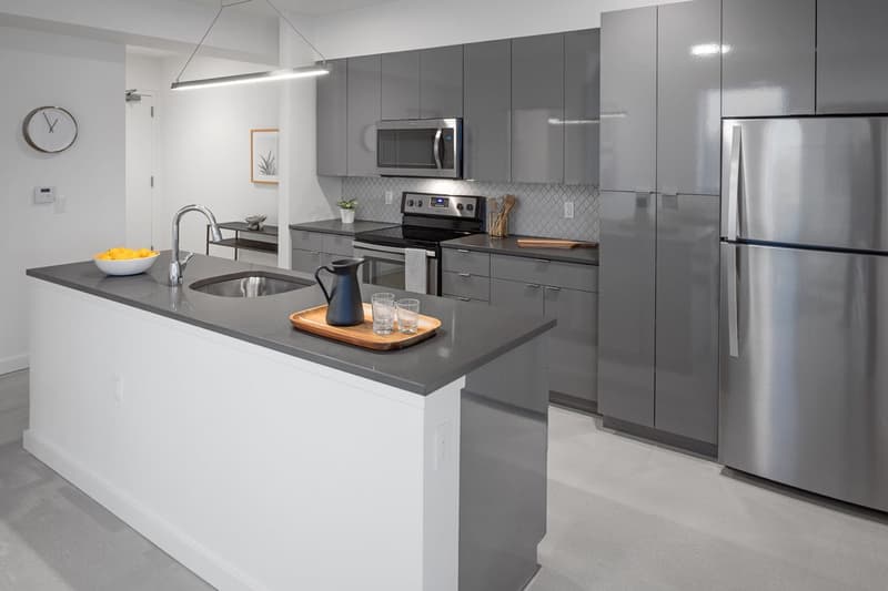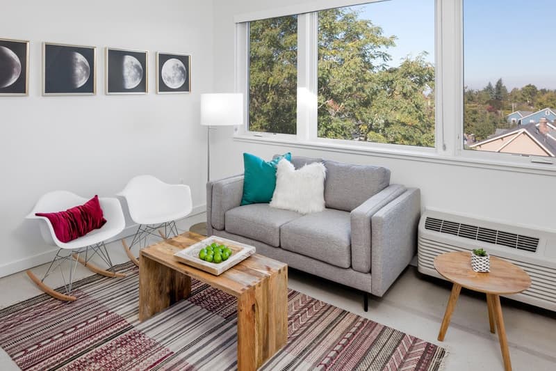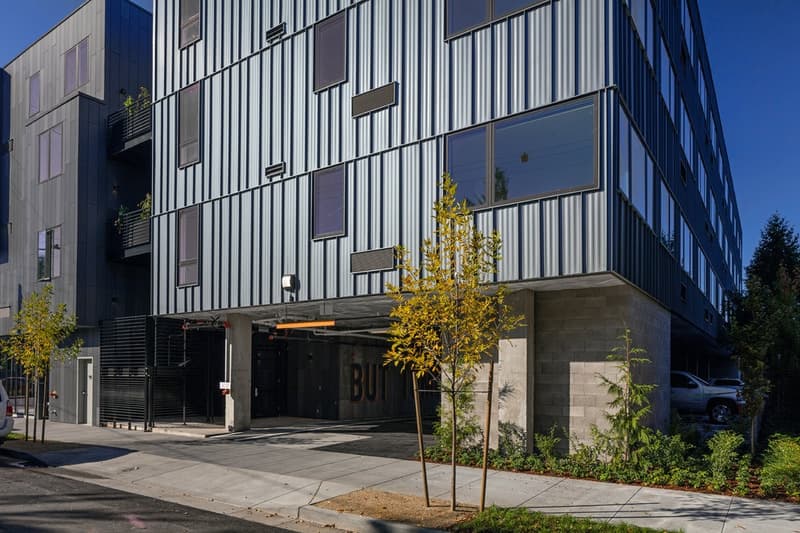Studios and one‑, two‑, and three-bedroom units are made of durable materials and offer sustainable appliances, flexible floor plans, and skylights. A floating yoga room with a roll-up garage door and a rooftop deck encourage the growth of this community within a community. A large bike storage area, complete with repair station, strengthens the Bridgetown’s mission of environmental awareness and overall sustainability.